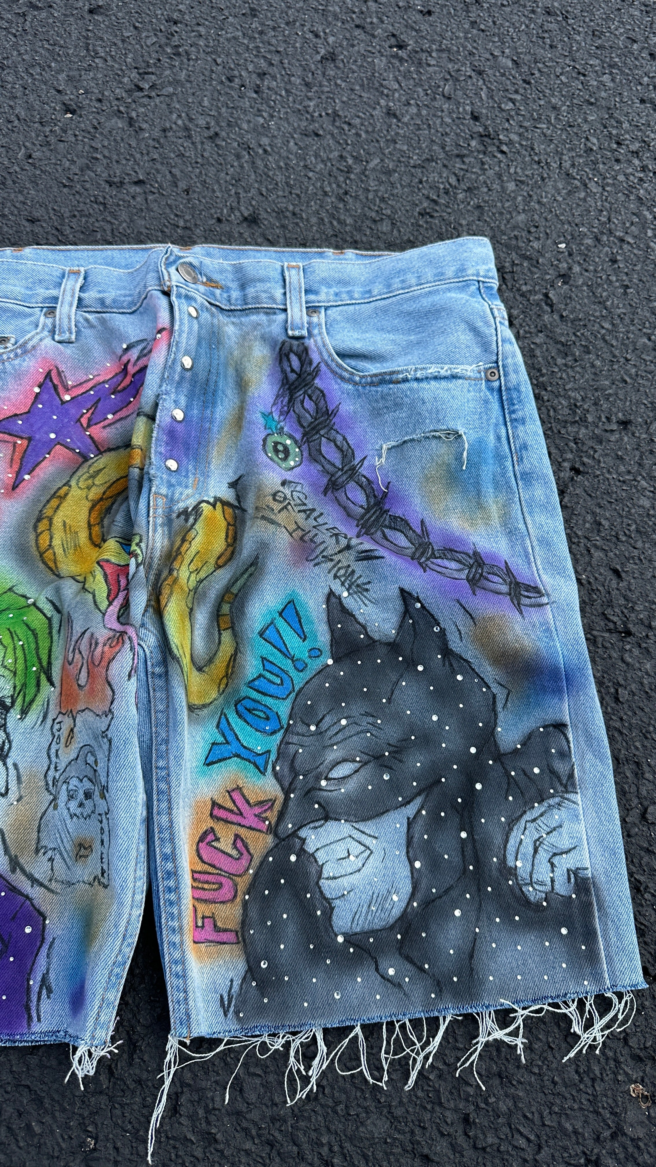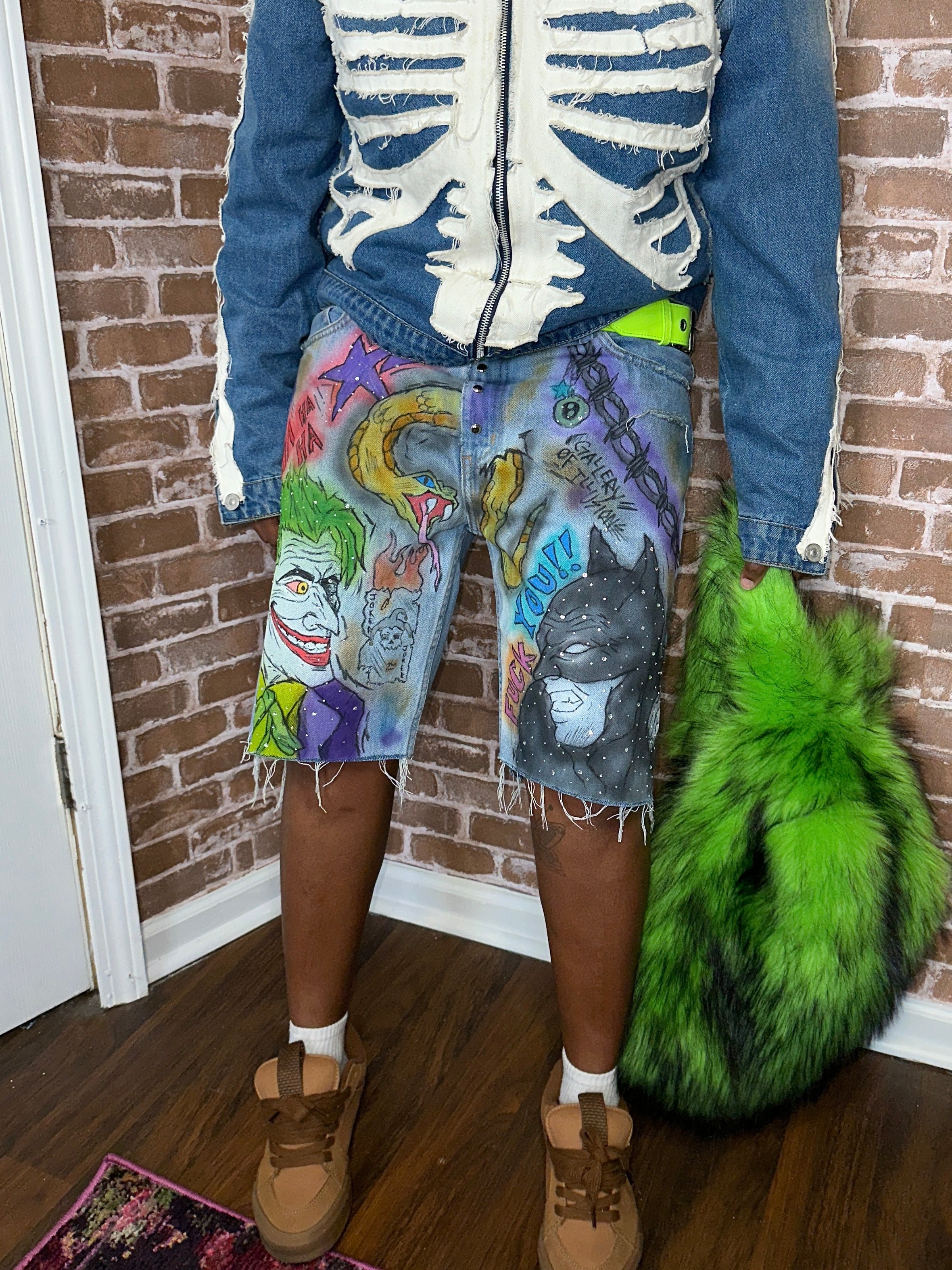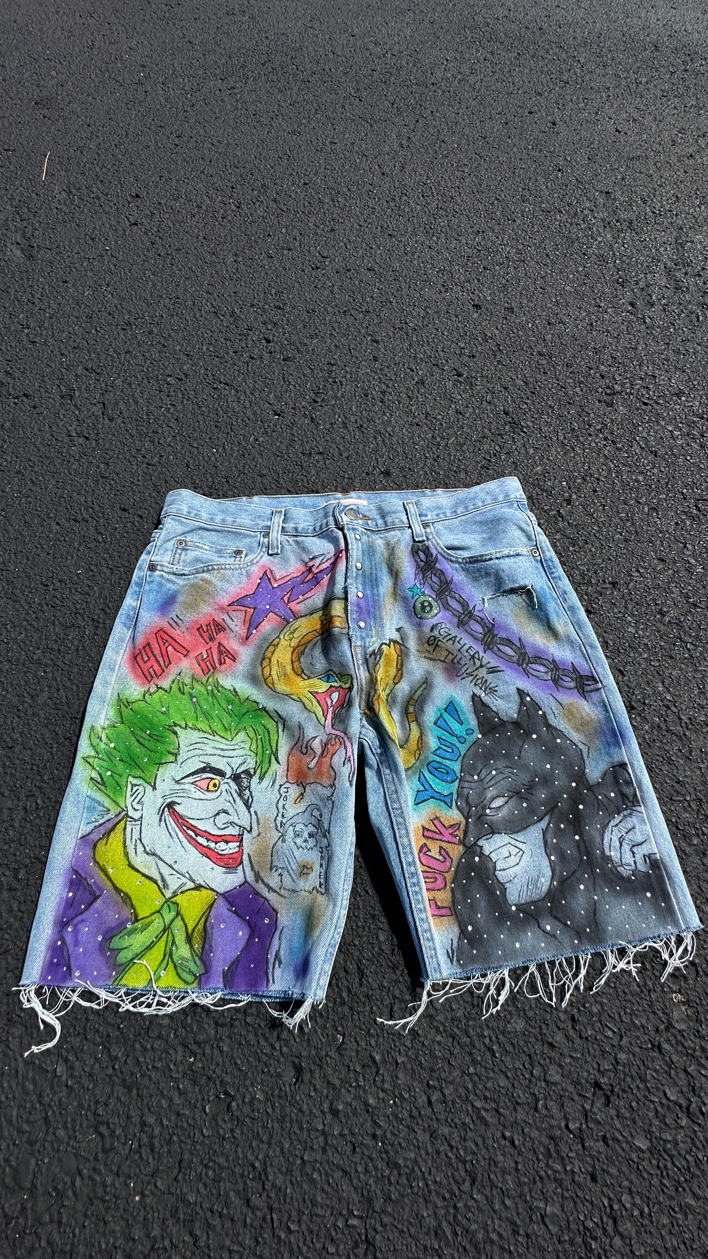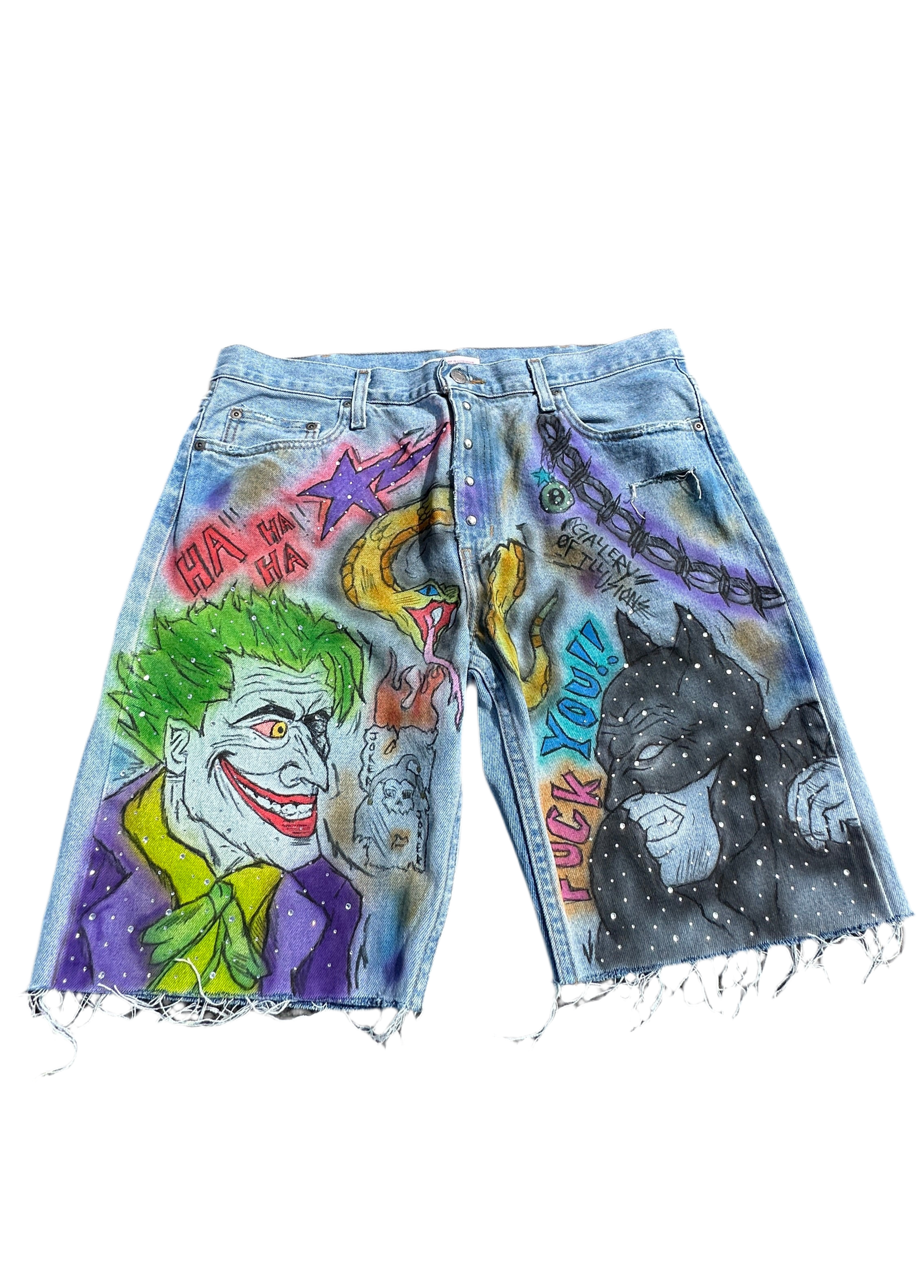 "Experience the ultimate showdown in style with our GOI JOKER VS BATMAN shorts. Featuring air brushed details, rhinestones, and iconic characters from the DC universe, these shorts are a must-have for any fan. With a comfortable 10in inseam and raw cut finish, you'll feel like a true superhero while wearing them."