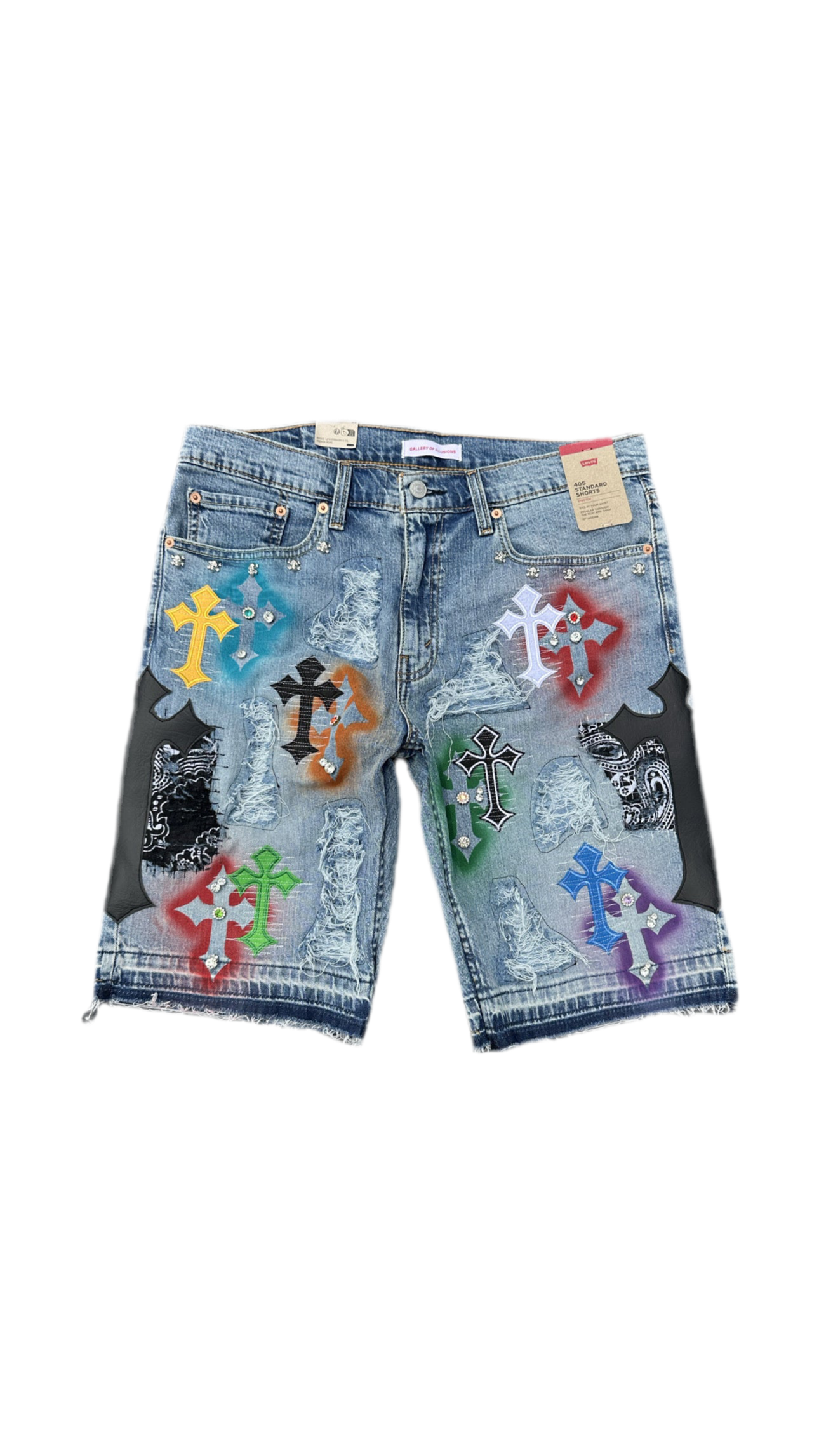 Turn heads with these one-of-a-kind custom denim shorts, featuring bold multi-color cross patches and airbrushed details. Designed on classic Levi’s 405 denim, these shorts blend vintage distressing with modern streetwear vibes. Black leather appliqués and bandana print inserts add texture and edge, while rhinestone accents bring just the right amount of shine. Perfect for making a statement, every pair is handmade and completely unique.